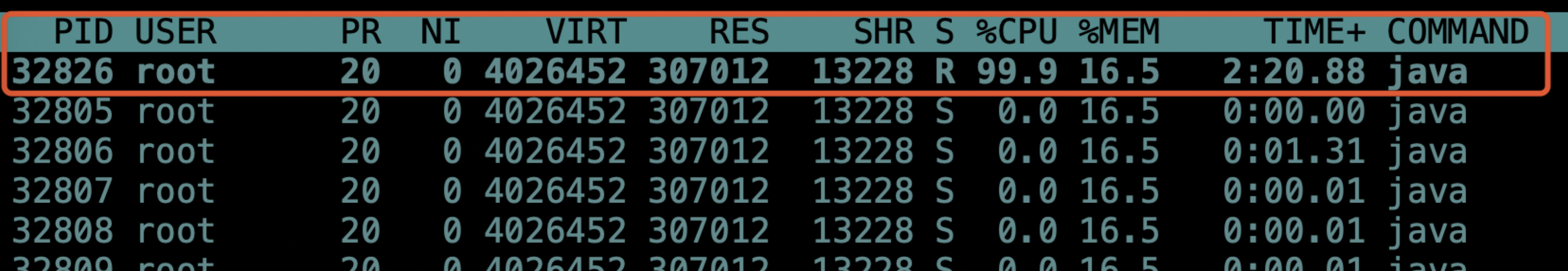 87093 root 20 0 4194788 299056 13252 S 399.7 16.1 65:34.67 java PID USER PR NI VIRT RES SHR S %CPU %MEM TIME+ COMMAND