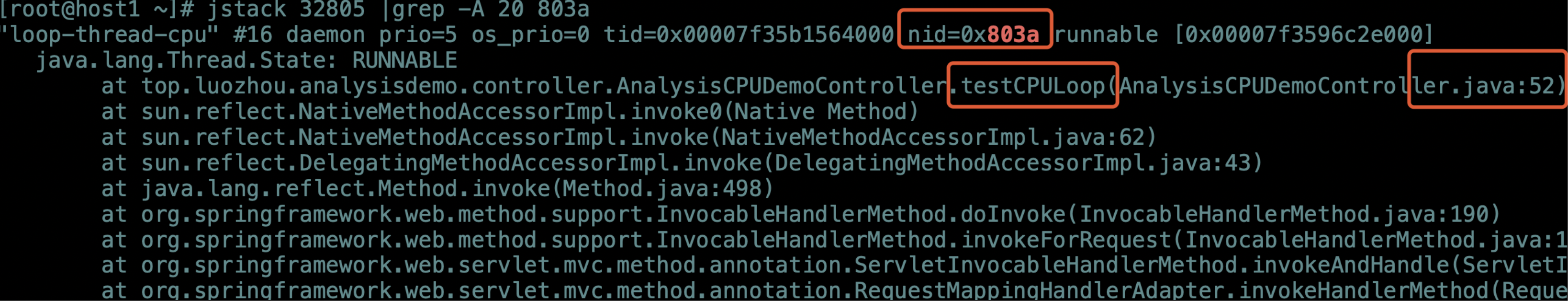 执行 printf '%x' 32826 获取16进制的线程id,用于dump信息查询,结果为 803a。最后我们执行jstack 32805 |grep -A 20 803a 来查看下详细的dump信息。