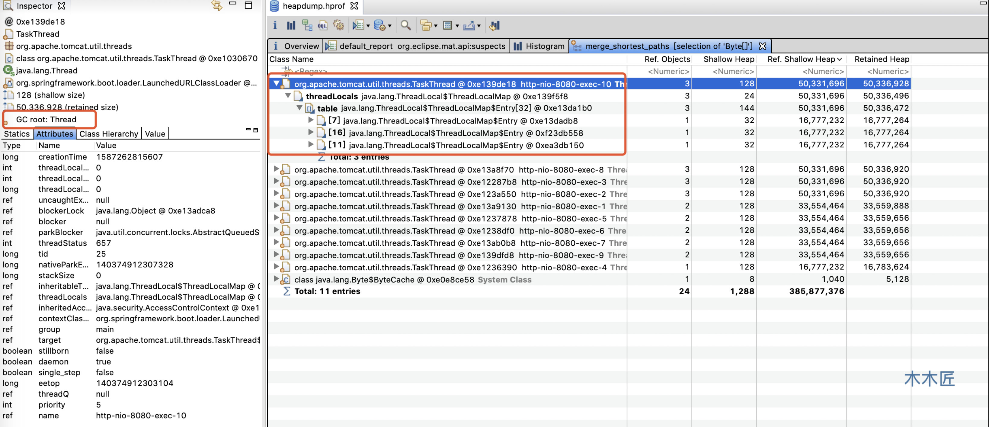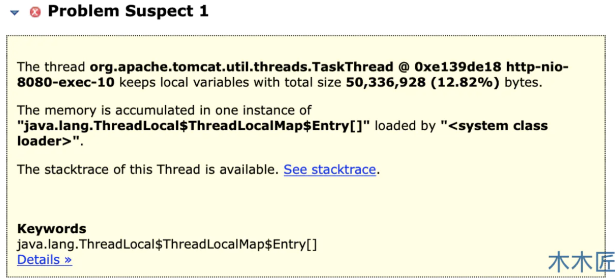 我们发现Byte数组是被线程对象引用的,图中也标明,Byte数组对像的GC Root是线程,所以它是不会被回收的,展开详细信息查看,我们发现最终的内存占用对象是被ThreadLocal对象占据了。这也和MAT工具自动帮我们分析的结果一致。