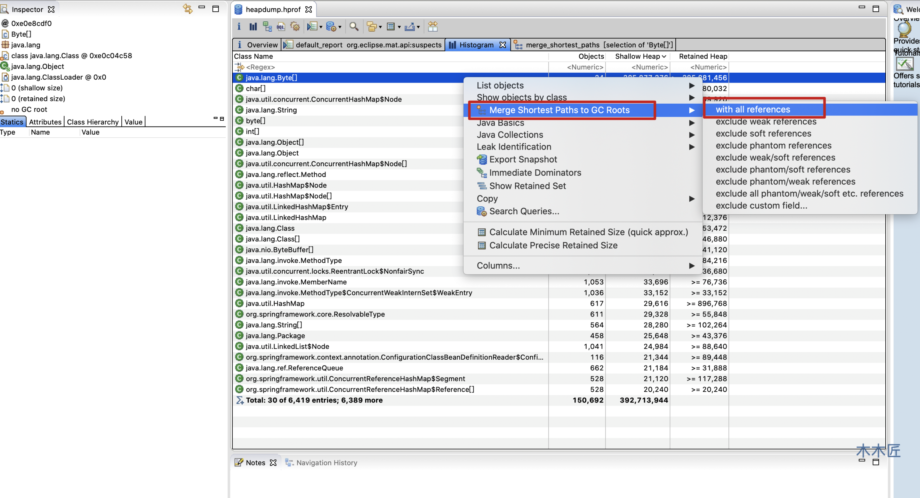 上图发现占用内存最大的对象是一个Byte数组,我们看看它到底被那个GC Root引用导致没有被回收。按照上图红框操作指引,结果如下图: